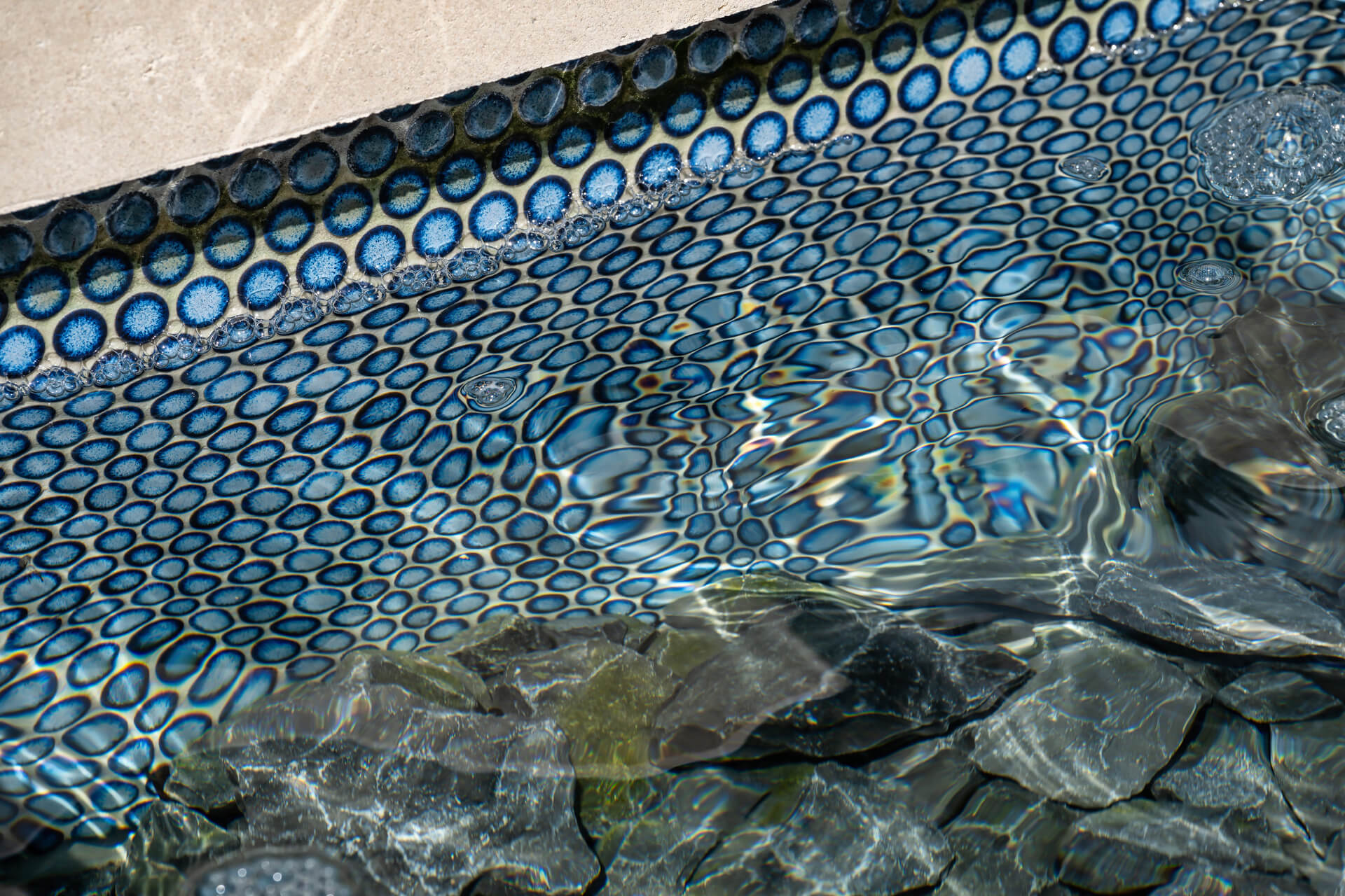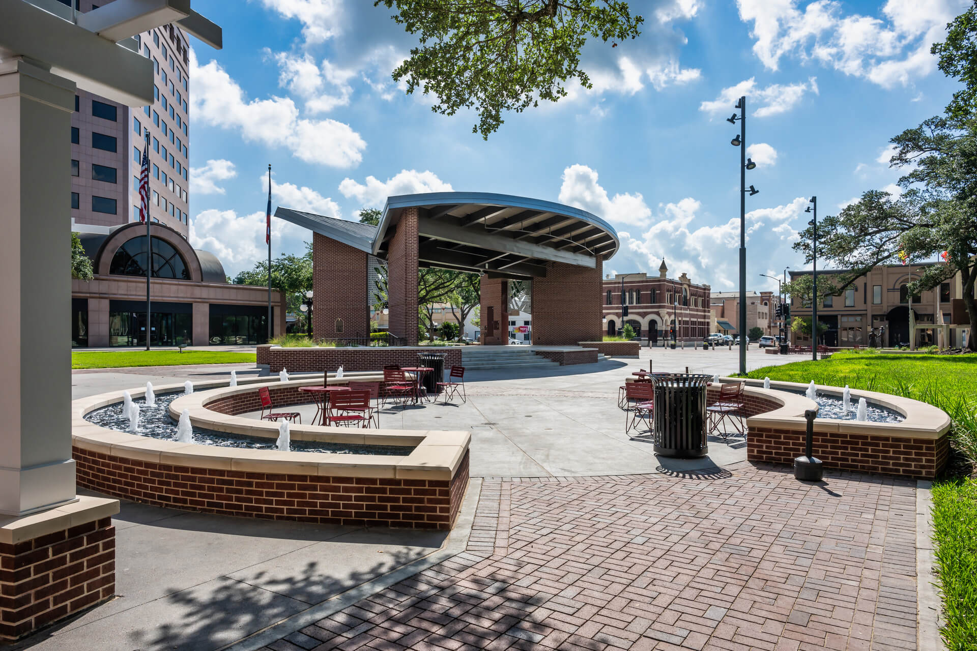 This historic gem known as as DeLeon Plaza was reimagined and is now the vibrant centerpiece of Downtown Victoria, TX. The intersection of landscape pathways culminates at the circular Water Feature. The Water Feature was split to create a central gathering space where the passerby can relax between the bodies of water. While seated, one can enjoy the water sounds produced by frothy water bubblers that surround the seating area. Within its interior, the Water Feature is lined with beautiful blue tiles and fractured stone at its base.