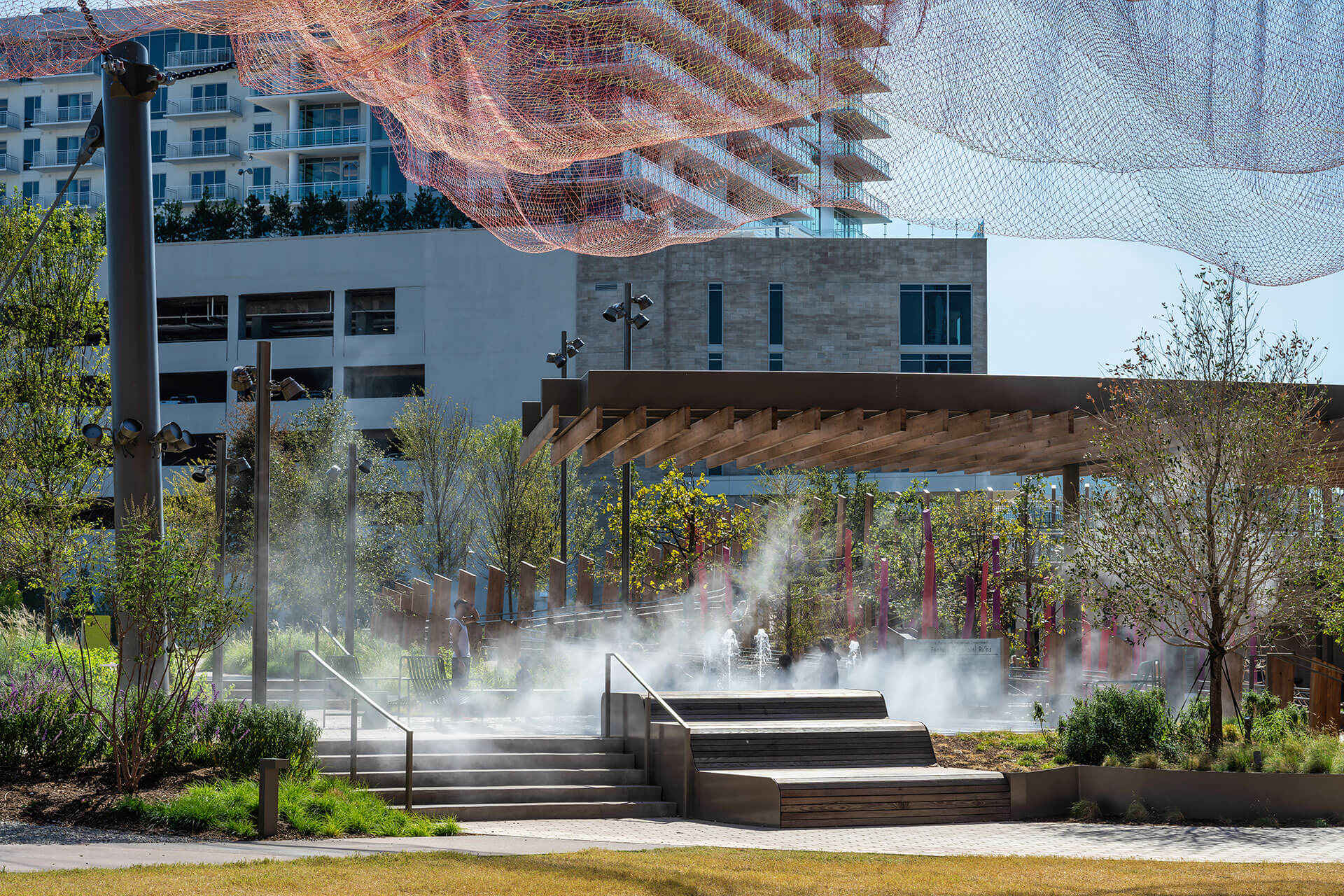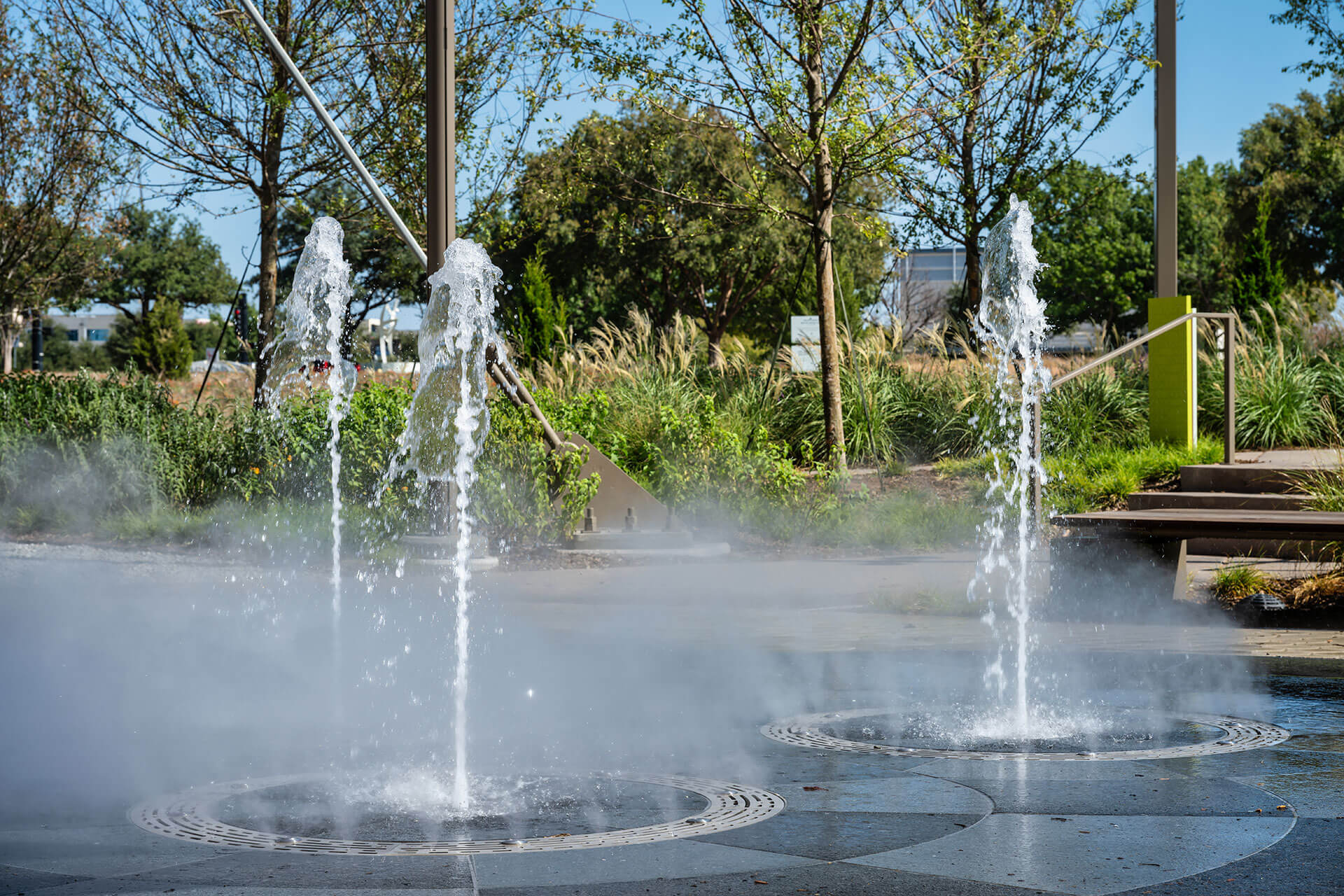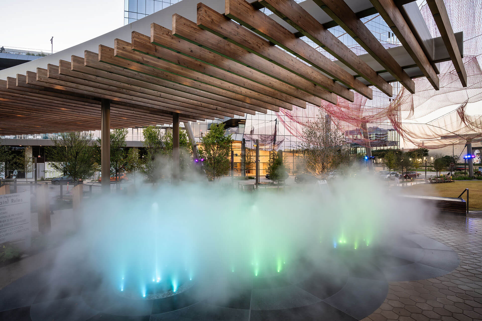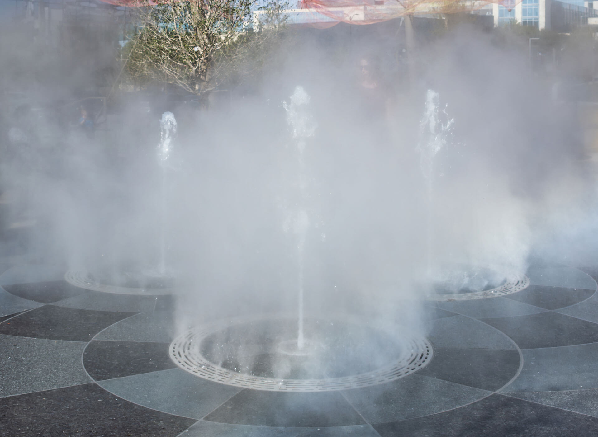 The Interactive Water Feature at Kaleidoscope Park is comprised of four (4) flush-mounted stainless-steel rings where mist emits into the air, cooling the space and engaging with the passerby. Centrally located within each ring is one (1) vertical standing water stream that provides playful visuals and water sounds peeking one’s curiosity from afar. Noctilucent clouds form at night when the mist and lights collide.