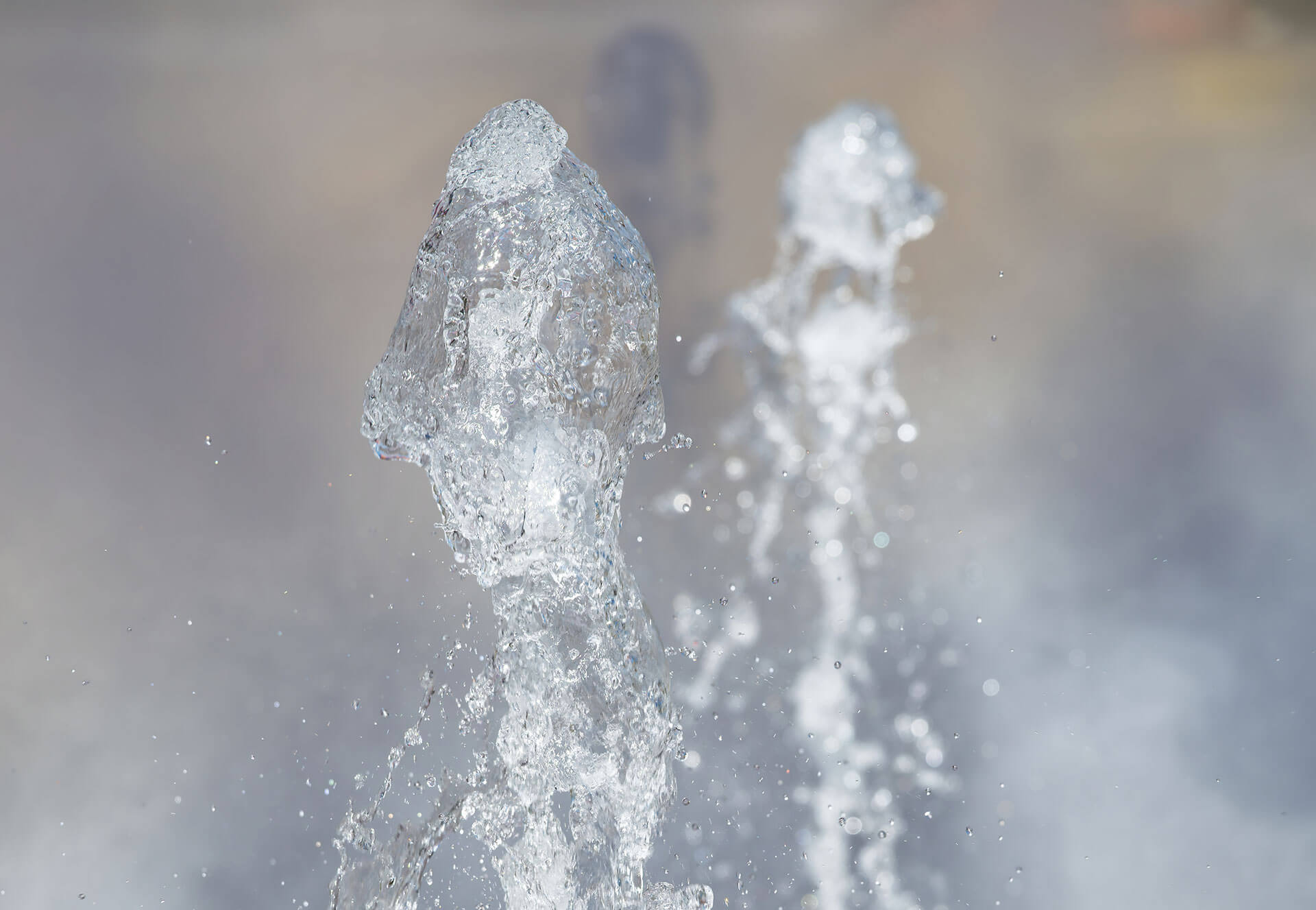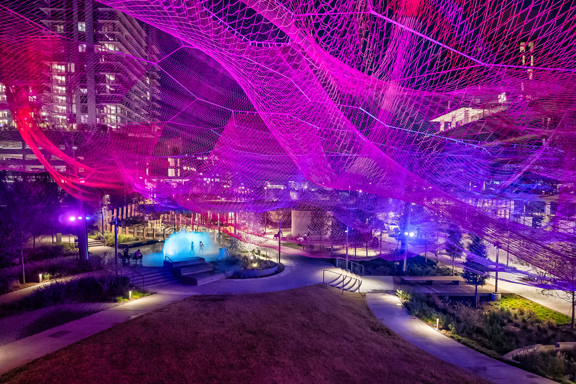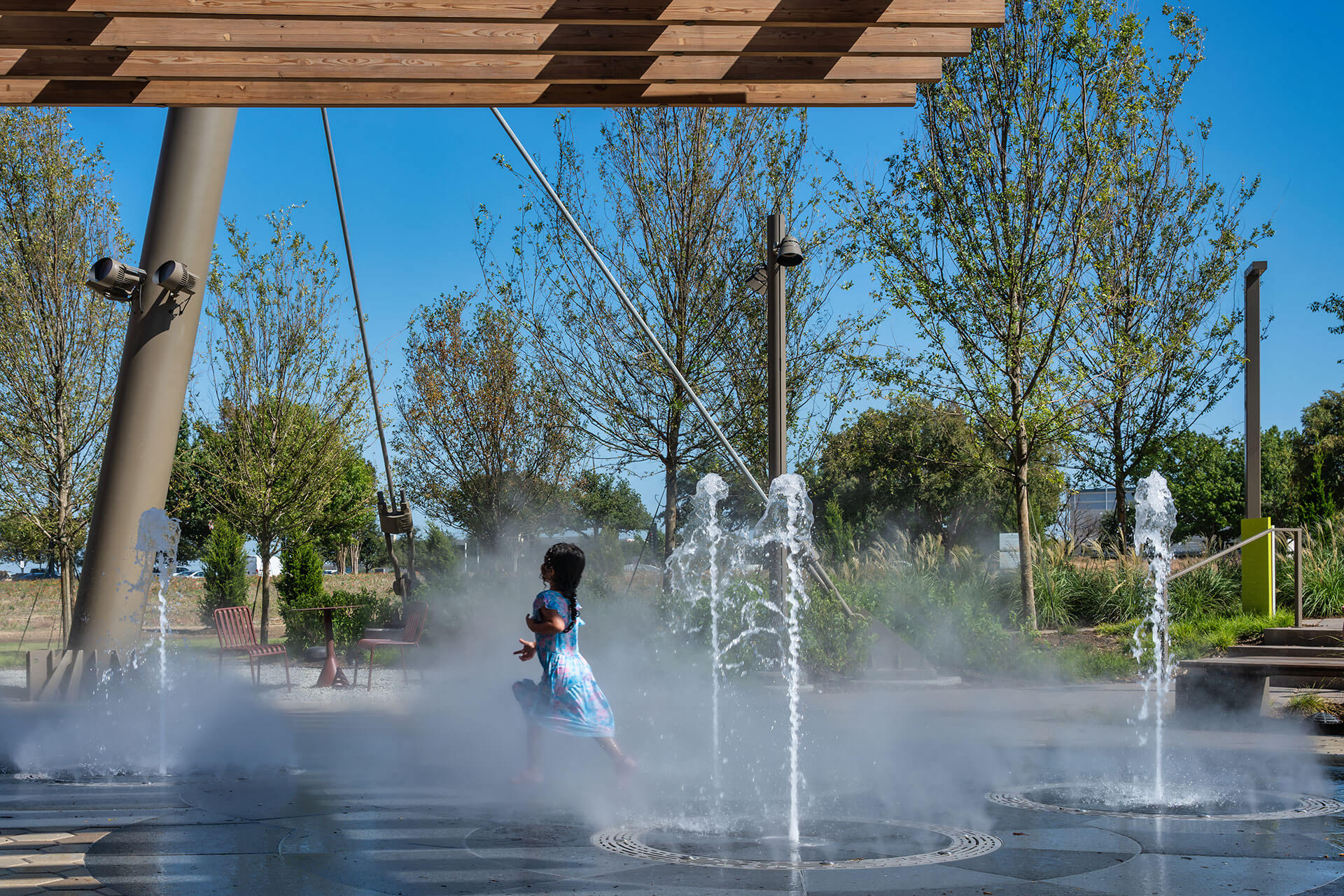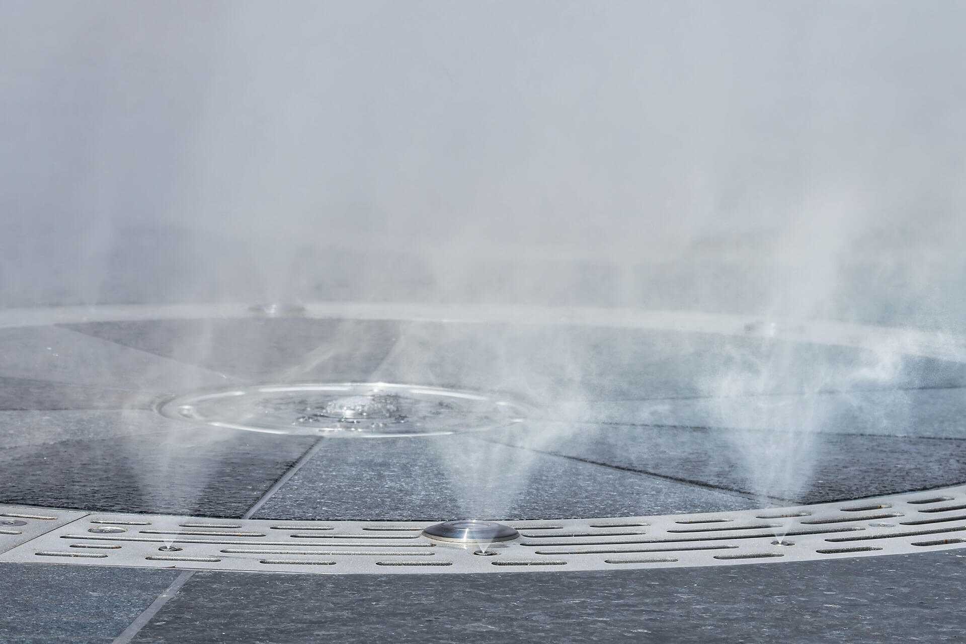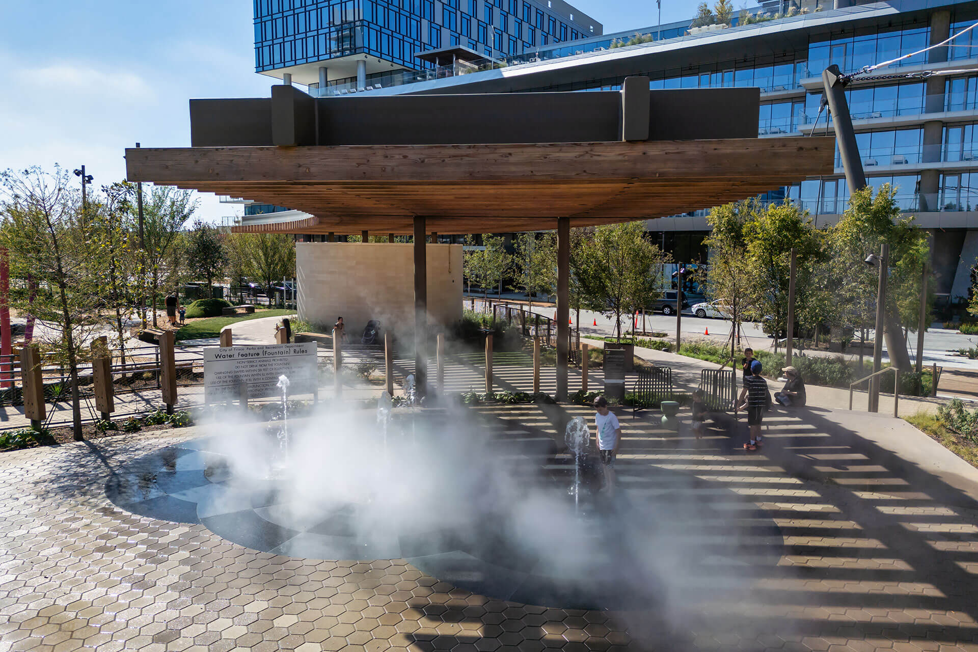 The Interactive Water Feature at Kaleidoscope Park is comprised of four (4) flush-mounted stainless-steel rings where mist emits into the air, cooling the space and engaging with the passerby. Centrally located within each ring is one (1) vertical standing water stream that provides playful visuals and water sounds peeking one’s curiosity from afar. Noctilucent clouds form at night when the mist and lights collide.
