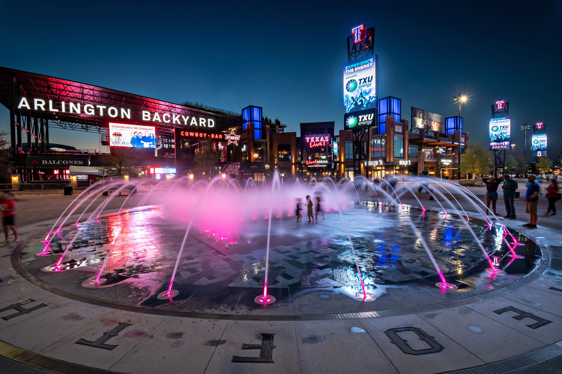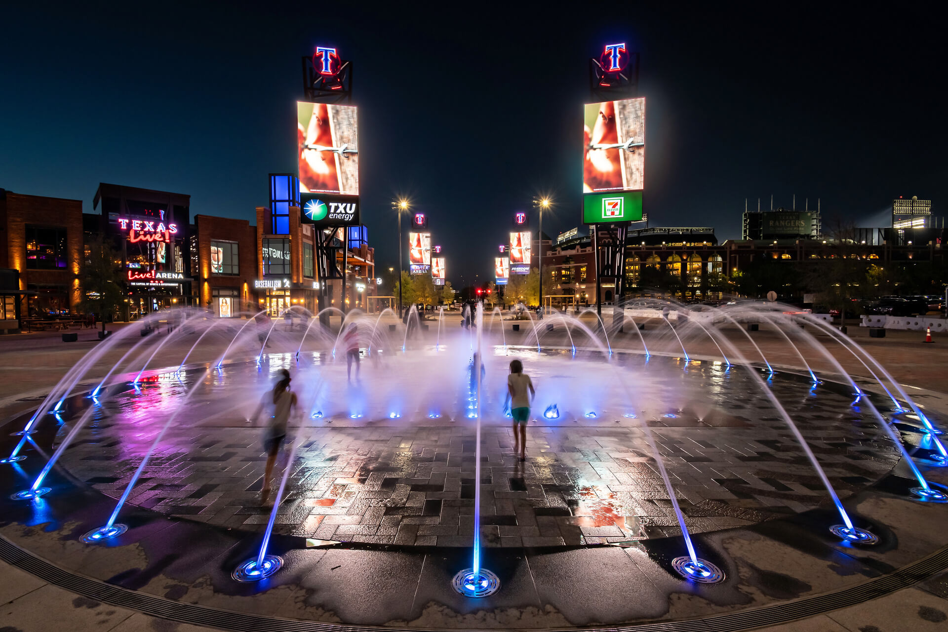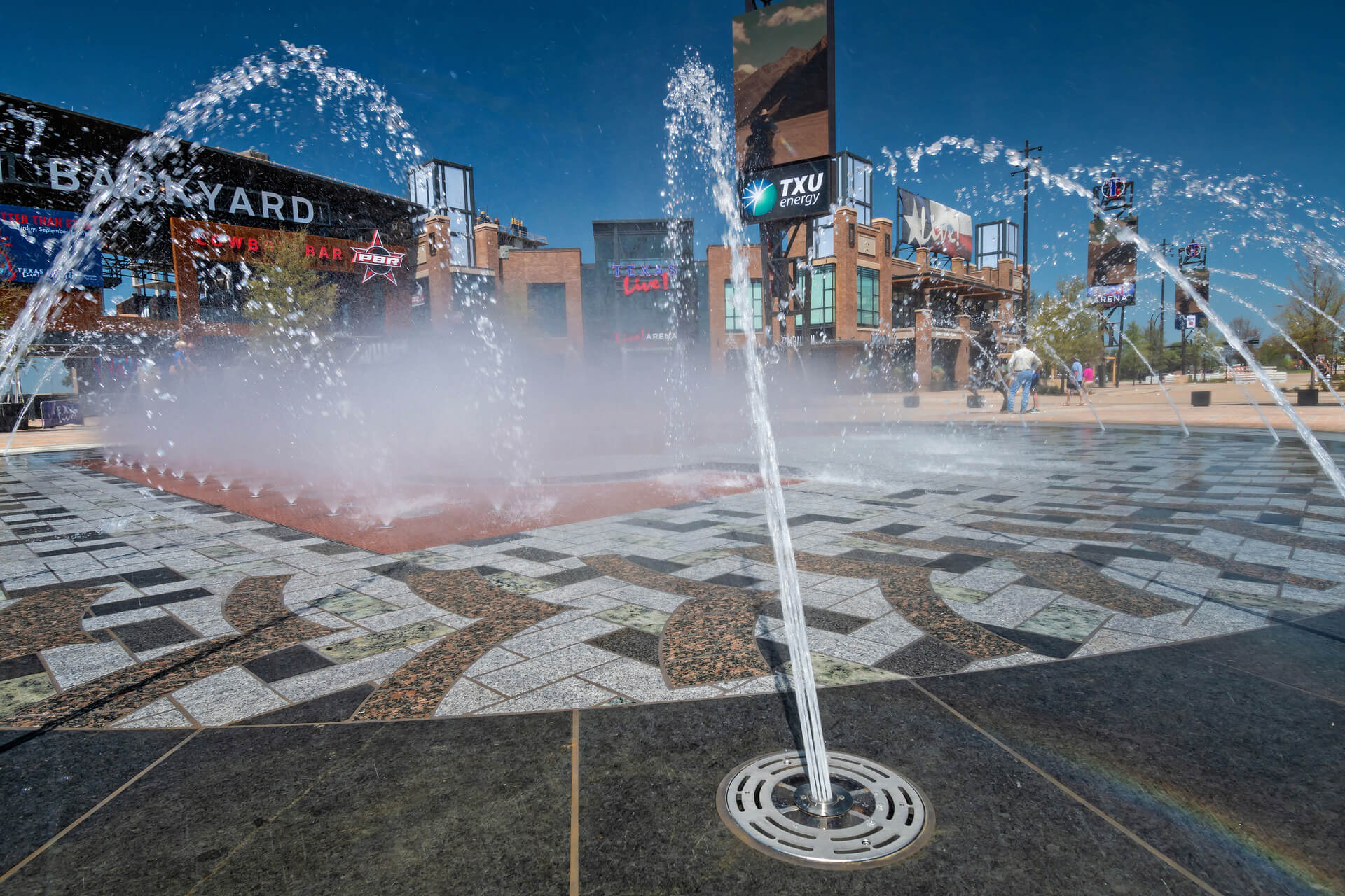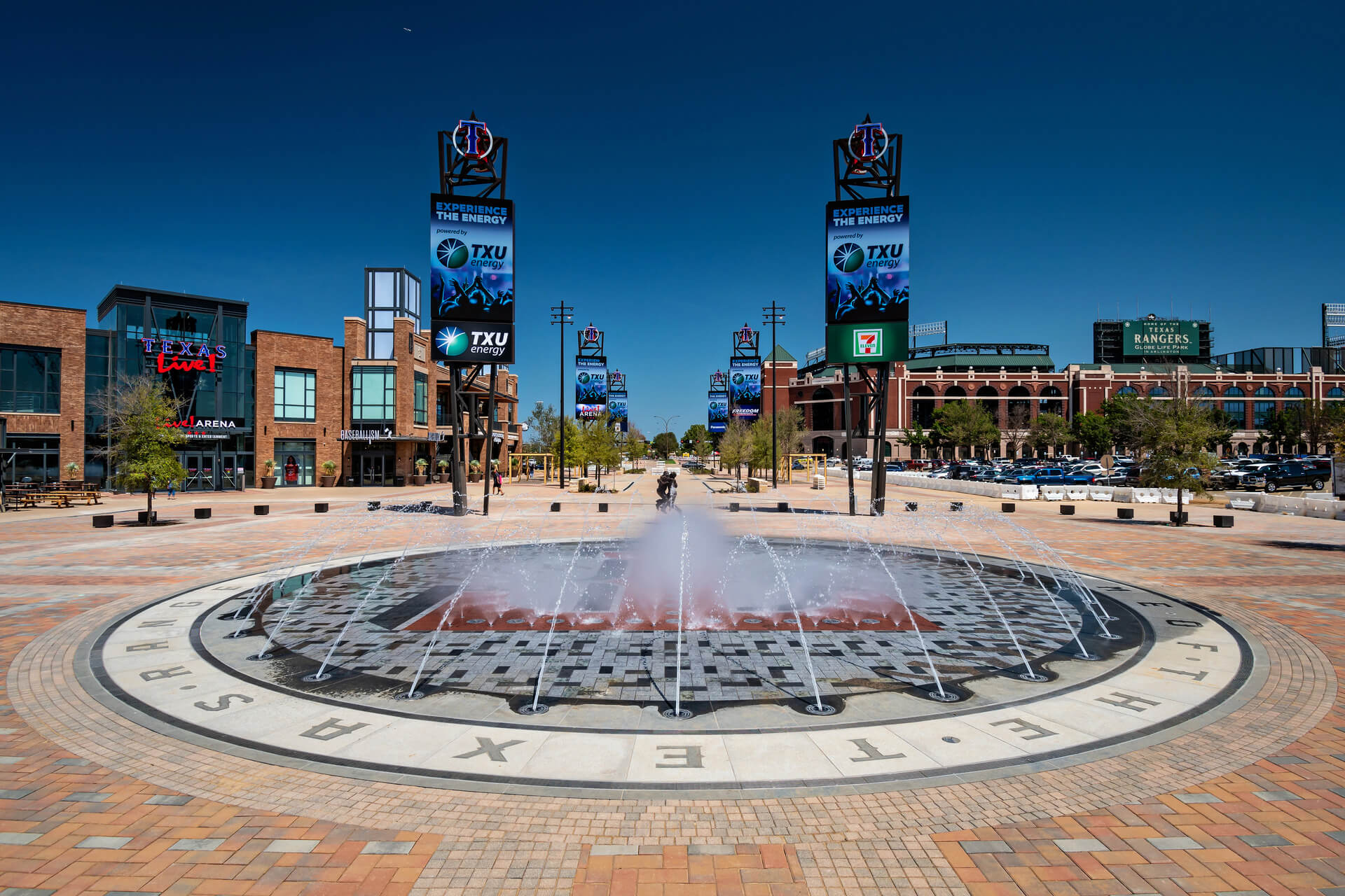 The circular Interactive Water Feature is located along a plaza near Texas Live and Globe Life Park. It is comprised of a ring of arching streams and a zone of equally spaced misters along the large, paved letter ‘T’ at the center of the Water Feature. The programmable arching streams and misters engage with the passerby, providing a space for play and entertainment for them and the onlookers alike.