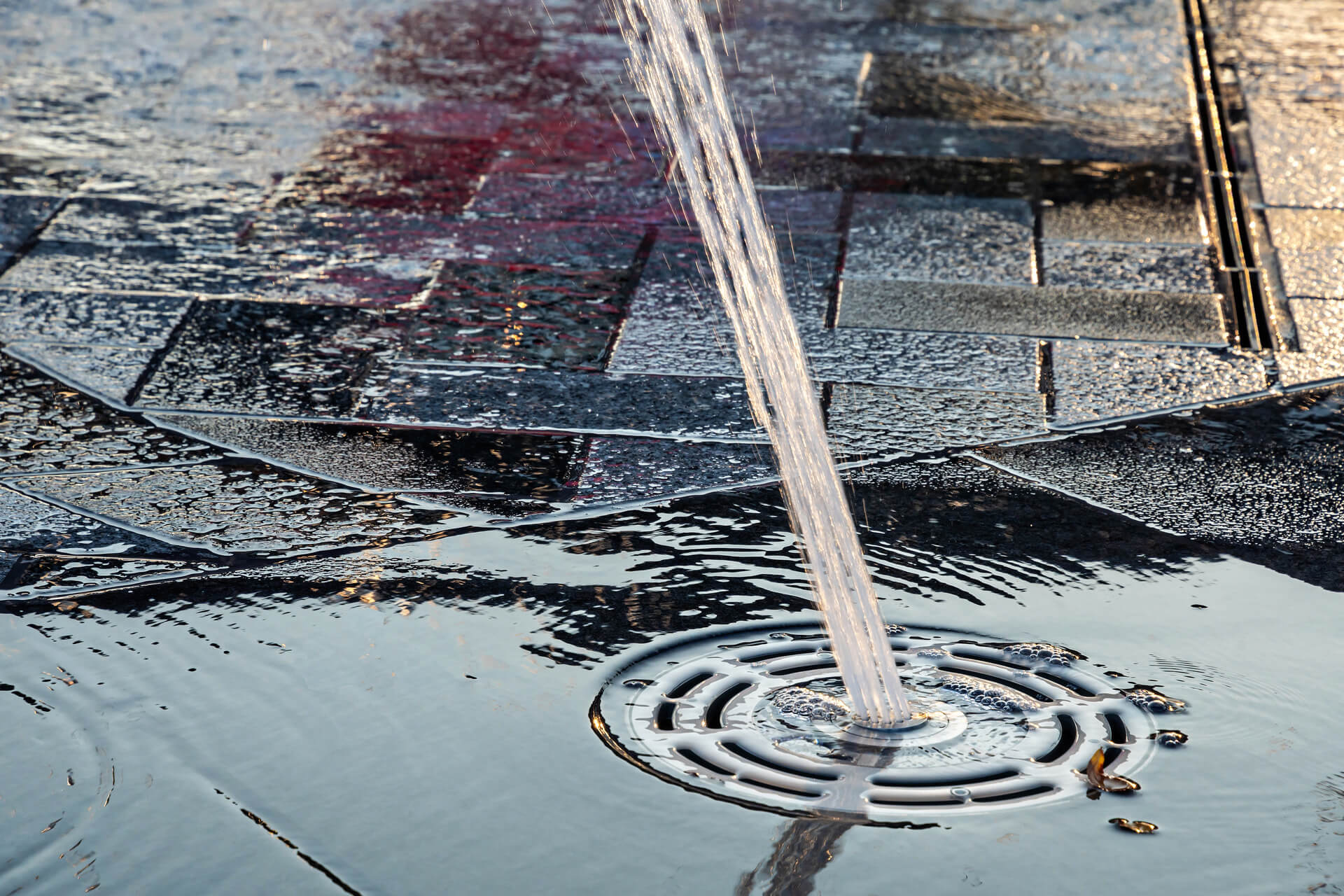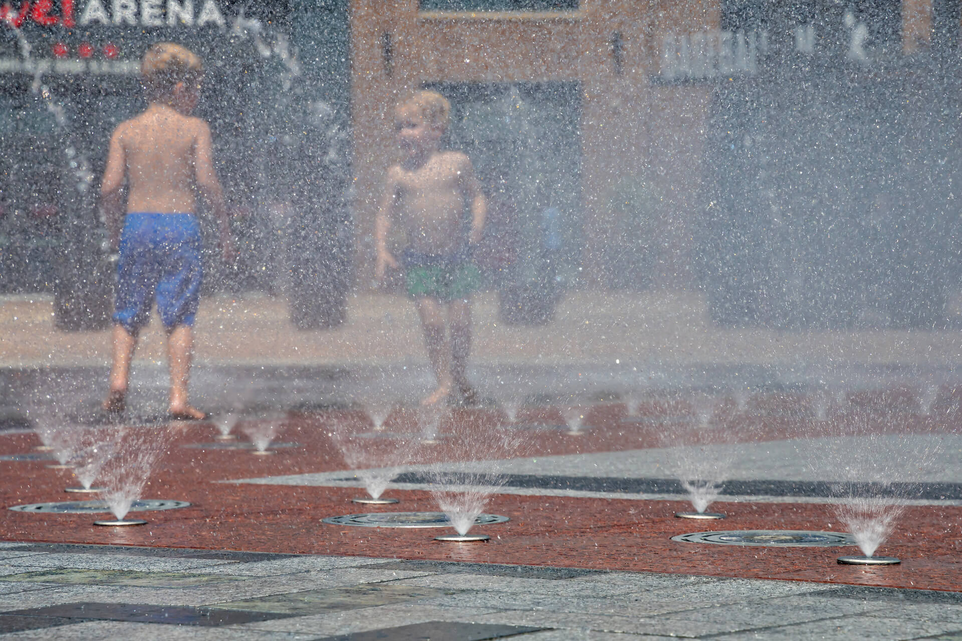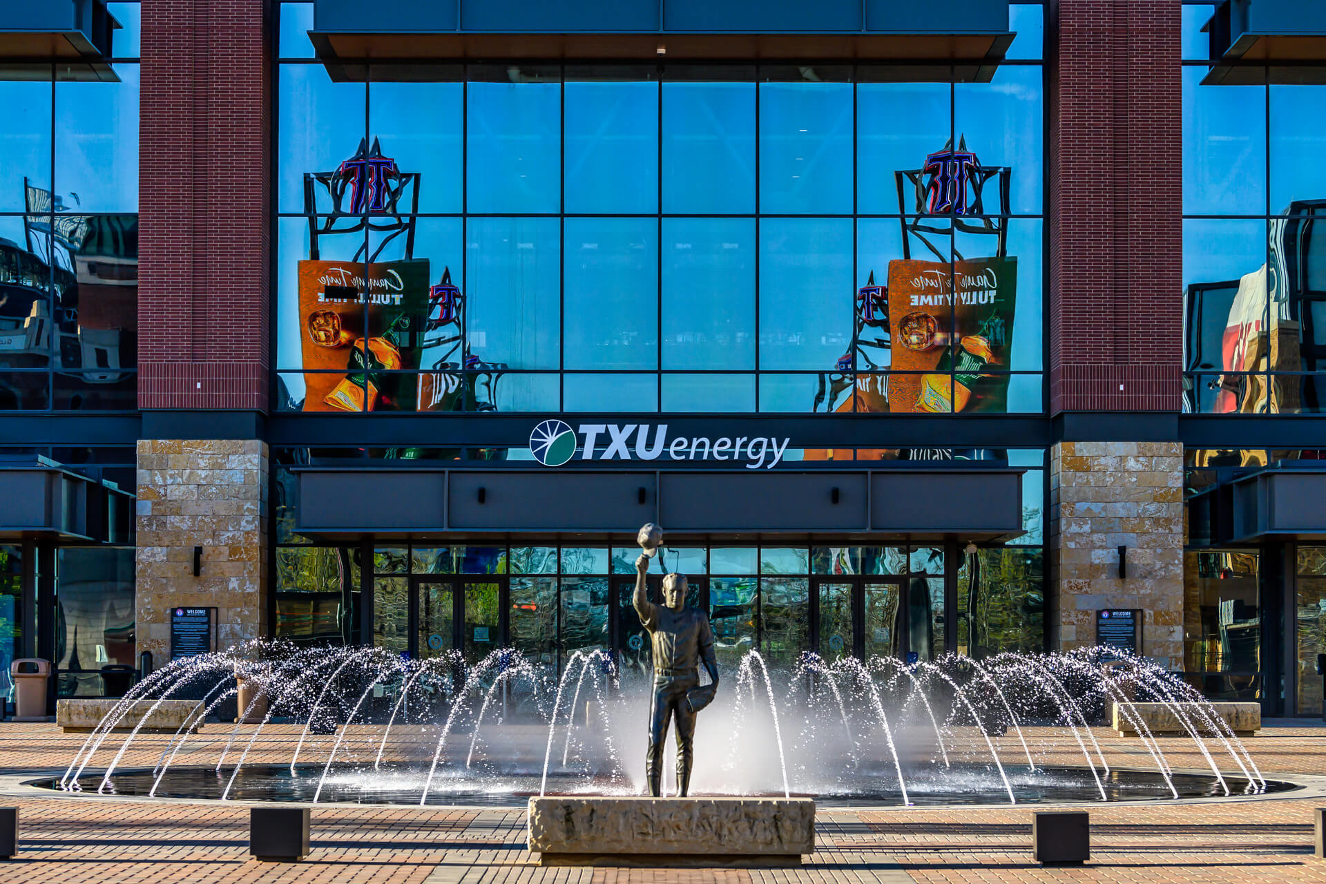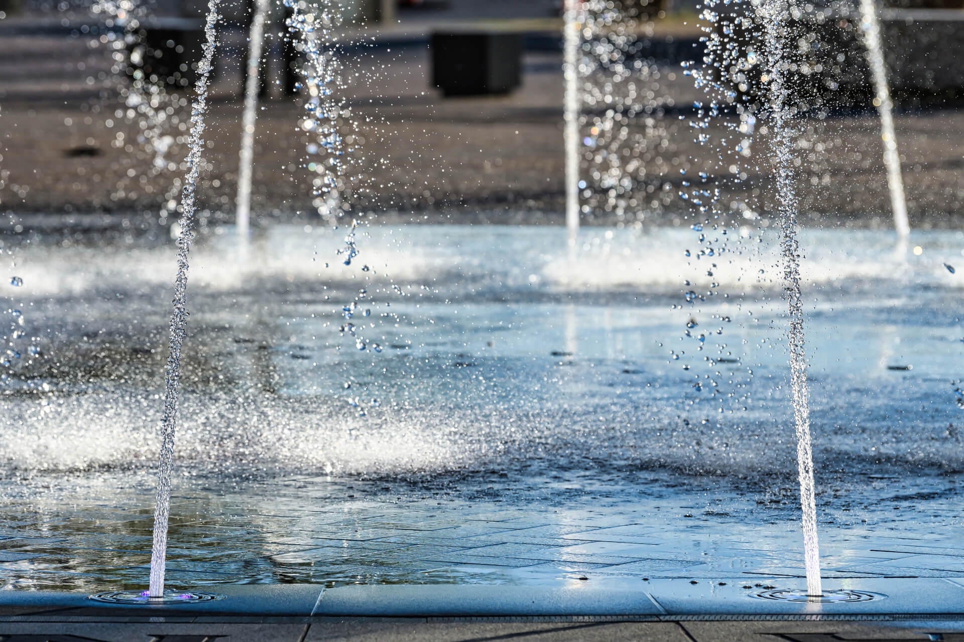 The circular Interactive Water Feature is located along a plaza near Texas Live and Globe Life Park. It is comprised of a ring of arching streams and a zone of equally spaced misters along the large, paved letter ‘T’ at the center of the Water Feature. The programmable arching streams and misters engage with the passerby, providing a space for play and entertainment for them and the onlookers alike.