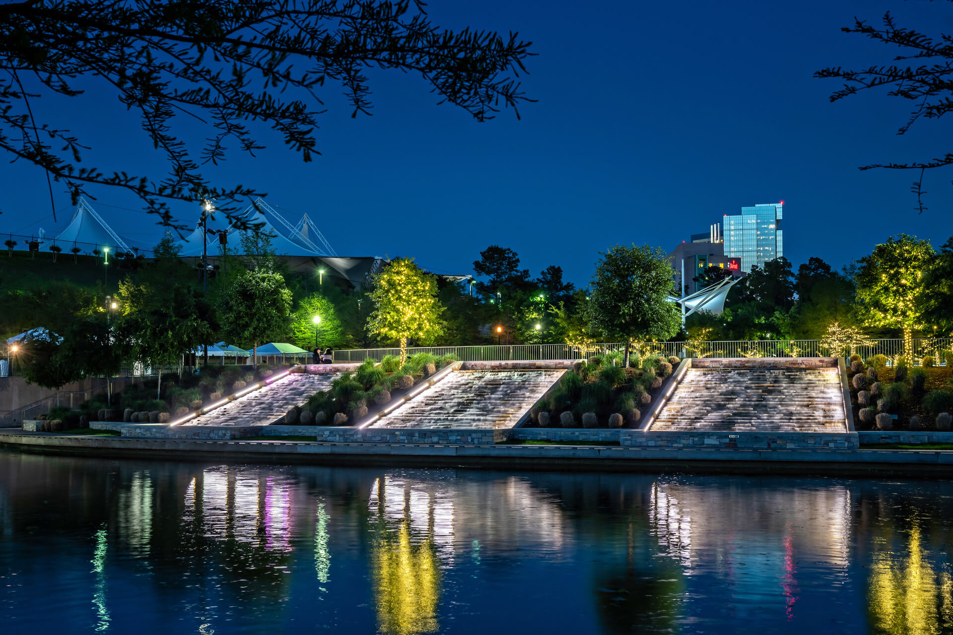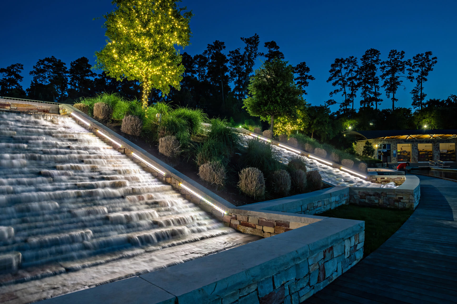 The three (3) Turning Basins act as a pedestrian transit hub between the Cynthia Woods Pavilion and the residential areas located on the other side of the waterway. The Water Feature is an attraction during the day and night. The basin’s water action is visually interesting as water cascades down varied stepped stone profiles, causing varied sounds and water action.
